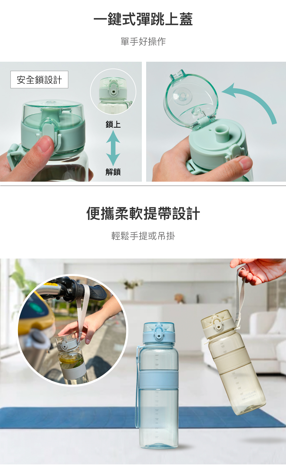 ★多款容量,矽膠腰環瓶身中央,好拿好握。上蓋安全鎖扣,攜帶不漏水
