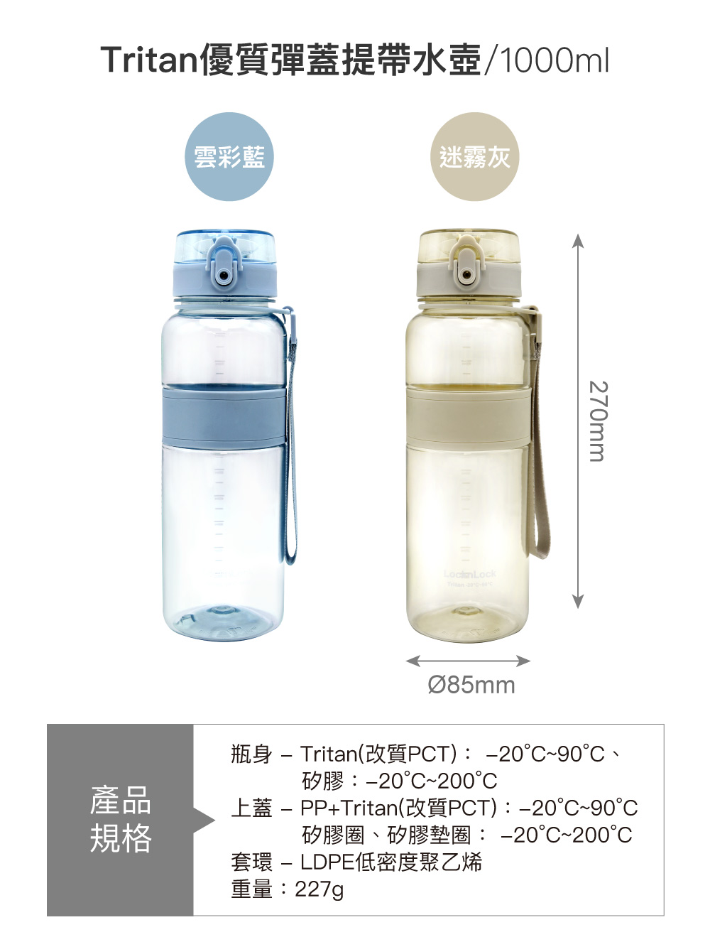 ★瓶身為Tritan(改質PCT)材質,材質輕巧安全,不含塑化劑及雙酚A。