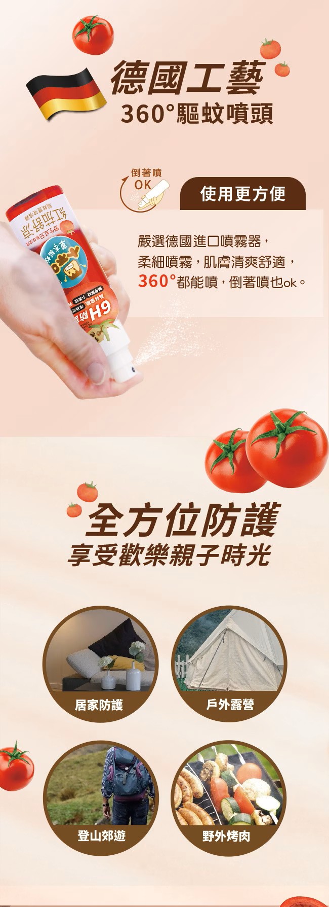 來自德國工藝特殊噴頭設計,倒著也能噴,360度全面驅蚊防護