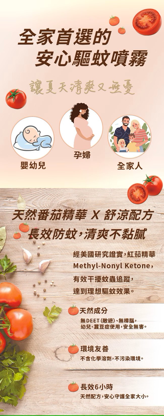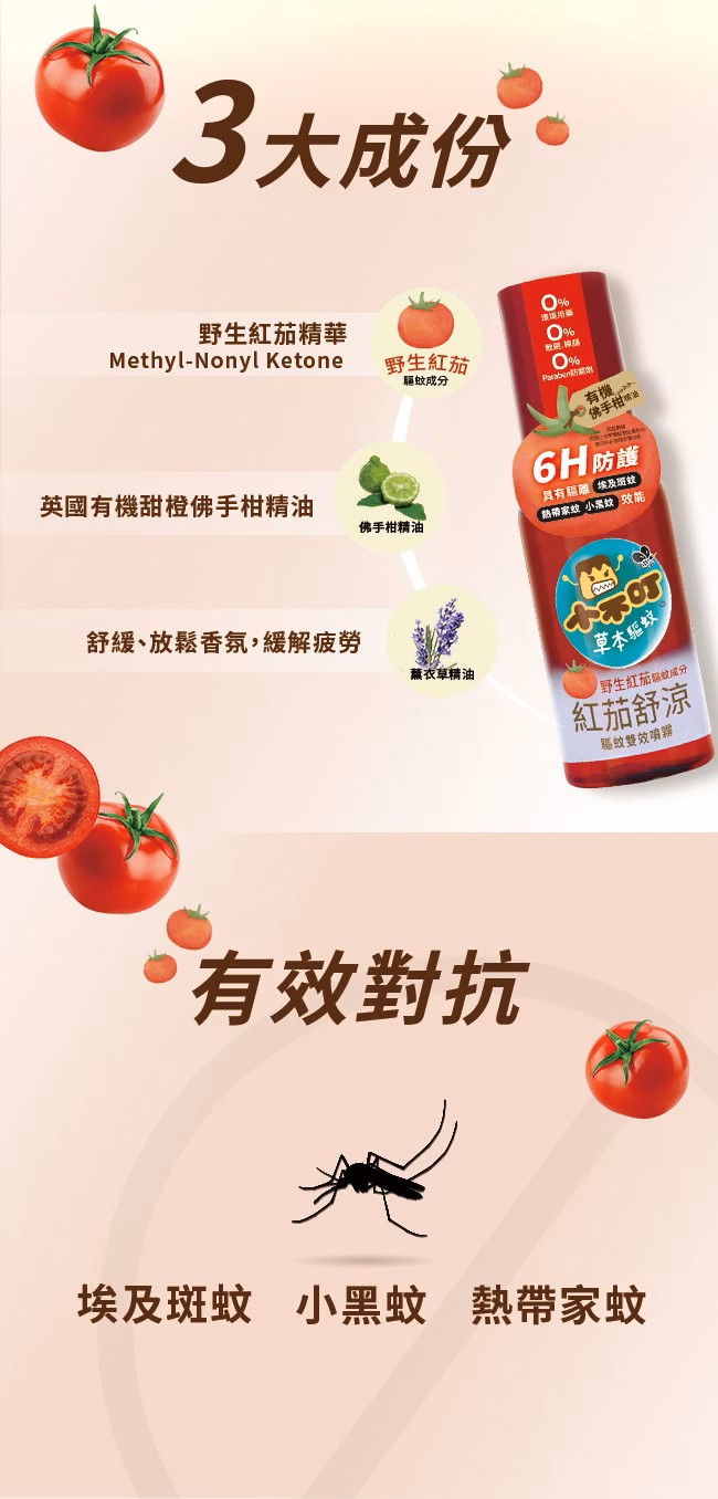 嚴選野生紅茄(Methyl-Noney Ketone)驅蚊成分,添加舒涼因子,嚴選有機佛手柑精油,結合薰衣草、白柚精油,具有驅離埃及斑蚊、熱帶家蚊、小黑蚊效能,體驗舒涼清爽防護力。